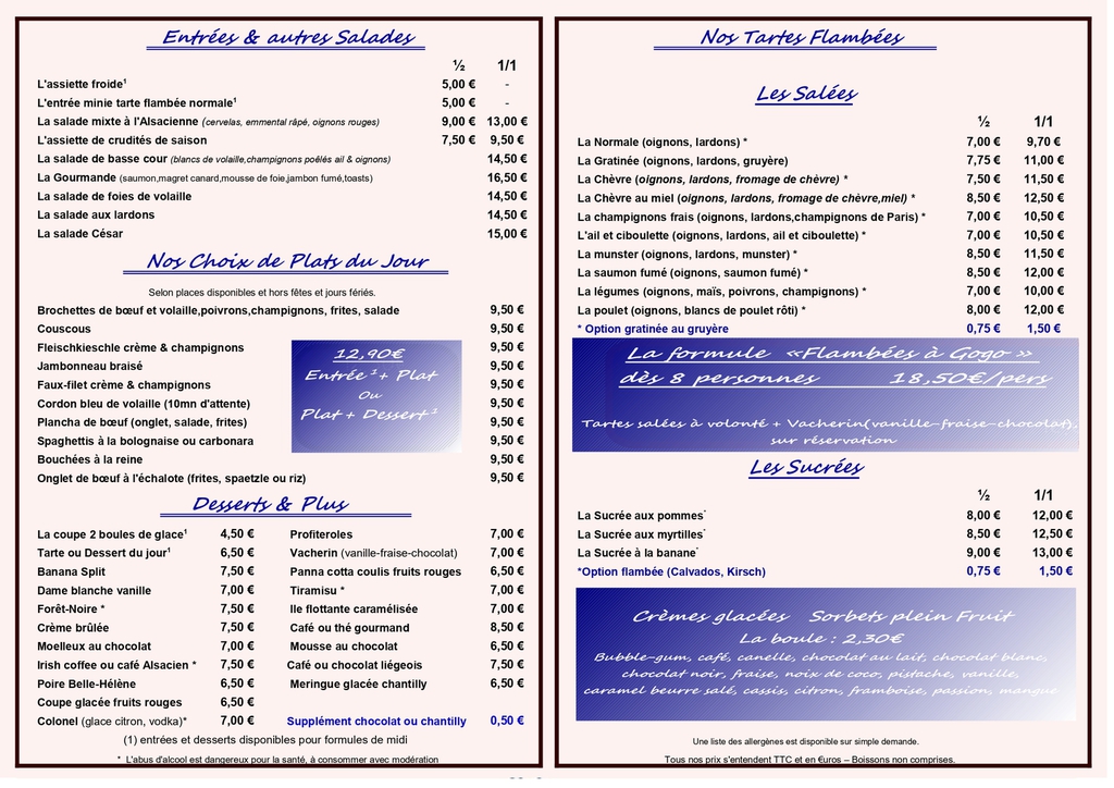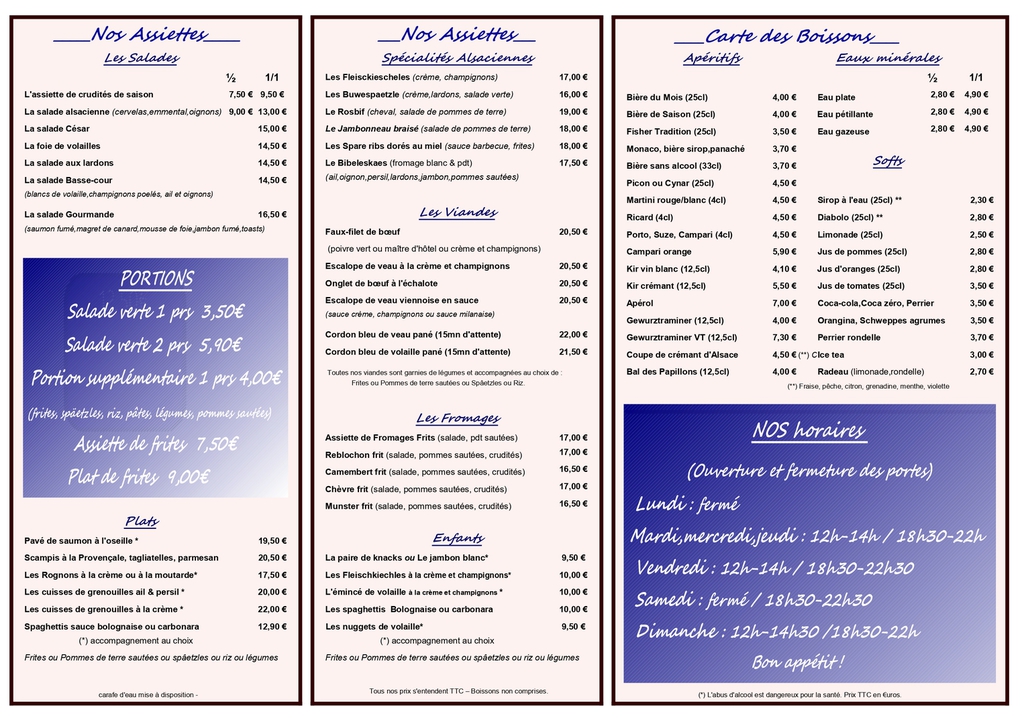 Qui dit Trois Fleurs, dit incontournables spécialités alsaciennes : buewespaetzle, fleichkiechle... mais vous pouvez également découvrir notre carte de différents plats du jour, même le week-end !
